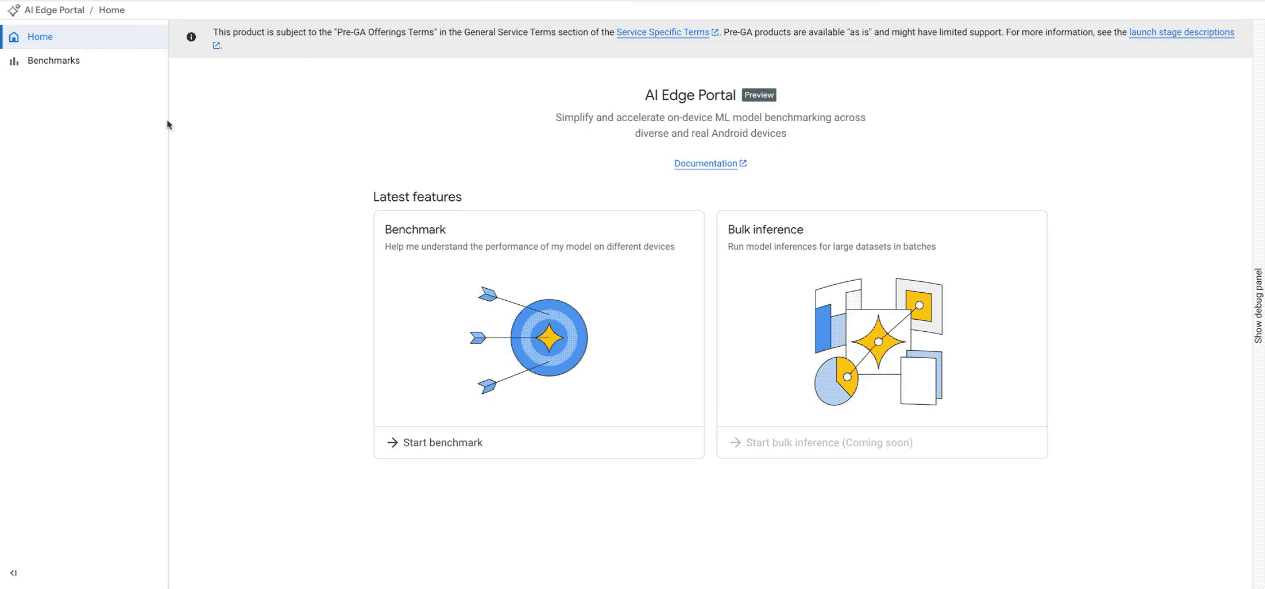 Google AI Edge Portal은 허용 목록에 추가된 Google Cloud 고객을 대상으로 비공개 프리뷰로 제공됩니다. 이 비공개 미리보기 기간 동안 미리보기 약관에 따라 액세스가 무료로 제공됩니다.