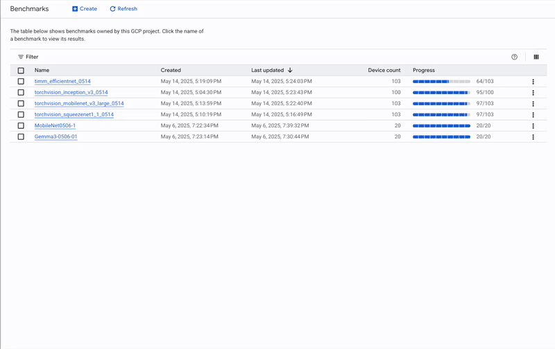 Menyederhanakan & mempercepat siklus pengujian di berbagai lanskap hardware: Menilai performa model di ratusan perangkat seluler perwakilan dalam hitungan menit tanpa kesulitan.